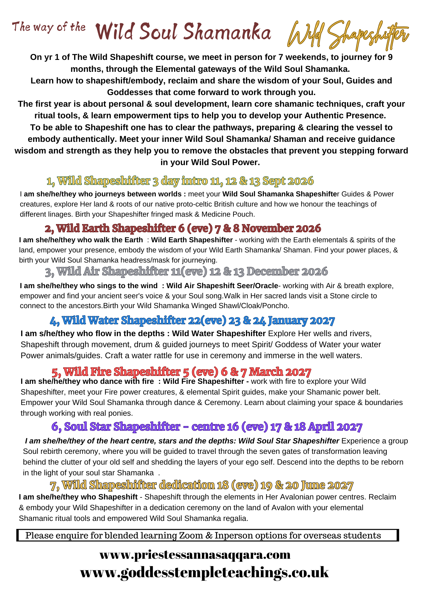 Is Goddess calling to your Soul to Empower and develop your skills by listening to and developing a relationship with your own soul guides, your inner Shamanka / Wisewomen / shaman? Learn to Shapeshift, Way Show and Weave by listening to and embodying your authentic soul presence and wisdom, through this shamanic Wild Shapeshifter 9 month container.