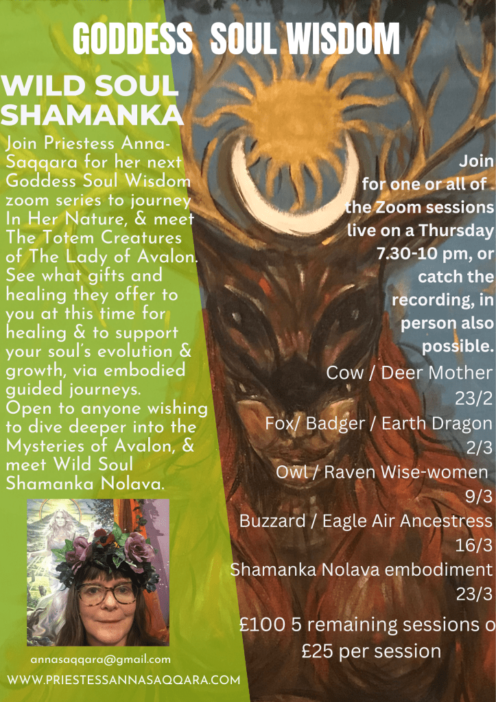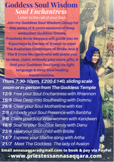 Join Priestess Anna-Saqqara for this series of 10 Goddess Soul Wisdom zoom sessions of guided jouneys & ceremonies exploring and diving deep into empowering your own inner Goddess Wisdom, to reclaim your soul gifts for healing & personal / Priestess development. An introduction to my Soul Priestess Pathway suitable for all.